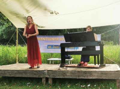 Für eine wunderbare Atmosphäre sorgten die beiden Musikerinnen Anna Bertram und Ronja Weyhenmeyer bei ihrem Auftritt im Rahmen der Berkenthiner Sommerkonzerte am letzten Freitag, dem 16. Juli. Bei sommerlichen Temperaturen hatten wiederum rund 150 Besucher den Weg an die Kanalschleuse gefunden – und sie kamen auf ihre Kosten. So verzauberte die Sopranistin Ronja Weyhenmeyer, die aus dem Lauenburgischen stammt, aber inzwischen sowohl als gefragte Solistin als auch als Chorsängersängerin auf den großen europäischen Bühnen unterwegs ist, mit bekannten Puccini- und Verdi-Arien die abendliche Stimmung am Kanalufer. Bemerkenswert auch, dass ihre eine großen Tonumfang umfassende Stimme auch ohne jede technischen Unterstützung den weiten Raum zwischen Brücke und Kanalhering mehr als ausfüllte. Begleitet wurde sie dabei am E-Piano von ihrer Freundin Anna Bertram, die auch aus dem Herzogtum stammt und inzwischen ebenfalls als Opernsängerin und freie Musikerin auf vielen großen Bühnen zuhause ist. Unterbrochen wurde der Reigen der Arien buchstäblich durch Klavier-Intermezzi von Brahms und Schubert, die von Anna Bertram meisterhaft dargeboten wurden. Gelegentliche Störgeräusche durch vorüberfahrende Motorräder oder Erntefahrzeuge konnten den Hörgenuss nicht schmälern. Die Konzertbesucher bedankten sich mit anhaltendem Applaus und schließlich wiederum durch einen gefüllten Spendenhut. Nach zwei Zugaben endete schließlich ein wirklich hochkarätiger Musikabend, der vielen städtischen Bühnen alle Ehre gemacht hätte!