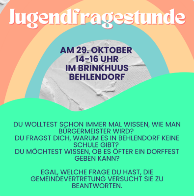 Am Samstag den 29. Oktober sind alle jungen Behlendorferinnen und Behlendorfer von 14 bis 16 Uhr ins Brinkhuus eingeladen, um sich bei Snacks und Getränken mit erwachsenen Vertretern und dem Bürgermeister der Gemeinde auszutauschen. Die Erwachsenen sind daran interessiert zu erfahren, was die Kinder und Jugendlichen in Behlendorf beschäftigt. Alle Teilnehmenden können Fragen rund um das Dorf stellen. Die Gemeindevertreter bemühen sich dann nach besten Kräften, diese Fragen zu beantworten. „Das ist die Gelegenheit für Kinder und Jugendliche, auf direktem Wege an Infos zu kommen und mit denjenigen, die im Dorf die Entscheidungen treffen, mal eine Runde ins Gespräch zu kommen.“ So Julianna Kundoch vom Kreisjugendring, die die Gemeindevertreter unterstützt und die Veranstaltung moderiert.