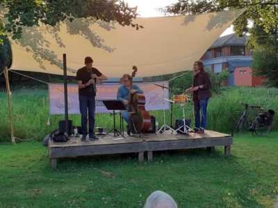 Die Berkenthiner Sommerkonzerte, veranstaltet von dem Kulturausschuss der Gemeinde, leben von der musikalischen Vielfalt und versuchen somit einen Großteil des musikalischen Spektrums abzubilden. Das erlebten die wiederum gut 160 musikinteressierte Besucher bei dem dritten Konzert der Reihe am letzten Freitag, dem 2. Juli. Nach den eher poppingen bzw. rockigen Klängen der Vorwochen stand dieses Mal das „Stefan-Kuchel-Trio“ aus Lübeck auf der kleinen Holzbühne am Kanal. Stefan Kuchel, Saxophon, Florian Galow, Kontrabass und Oliver Sonntag, Schlagzeug, demonstrierten an diesem Sommerabend einmal mehr den Abwechslungsreichtum des Jazz: Eingängig Töne des Mainstreamjazz wechselten mit sphärischen Klängen, ruhige Passagen, die zum Träumen einluden, wurden durch packende Grooves abgelöst. Traditionelle Klänge standen neben modernen und unbekannten Passagen. Bandleader Stefan Kuchel stellte zudem bei einigen Stücken seine musikalische Experimentierfreude durch den zeitweisen Einsatz eines Blaswandlers, eines elektronisches Blasinstruments oder Blassynthesizers unter Beweis. Am Ende des mehr als einstündigen Konzerts bedankte sich das begeisterte Publikum mit einem lang anhaltenden Applaus und einem gut gefüllten Spendenhut. Nach zwei Zugaben ging schließlich ein weiterer eindrucksvoller Musikabend an der Berkenthiner Kanalschleuse zu Ende.