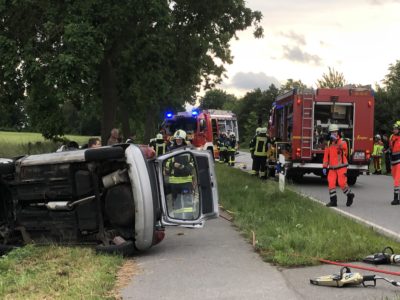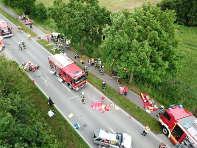 Das Szenario der Gemeinschaftsübung „Windschatten“ ist leider denkbar möglich. Auf der Landesstraße 92 vor Bliestorf kommt es bei einem Überholmanöver zu einem folgenschweren Verkehrsunfall, an dem vier PKW und sechs Fahrzeuginsassen mit teilweisen schweren Verletzungen beteiligt sind. Die Feuerwehren Bliestorf, Rondeshagen und Berkenthin sowie die Einsatzführung Amt (EFA) werden alarmiert.