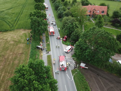 Unterstützt wurde die Gemeinschaftsübung von der Johanniter-Unfall-Hilfe (Lübeck) und dem Malteser Hilfsdienst (Lübeck). Übungsleiter Henning Witten, stellv. Wehrführer Reinhold Kock (Bliestorf) und Frederik Rudolf für den Übungsaufbau dankten allen beteiligten Wehren, Hilfsorganisationen, Beobachtern und sonstigen beteiligten Kräften für die erfolgreiche Durchführung der Übung. Noch am Abend wurde die Übung analysiert und mit den vorliegenden Rettungskonzepten abgestimmt. Erstmalig kam dabei auch eine Drohne zum Einsatz, die von den Einsatzkräften unbemerkt aus der Luft den Einsatz aufzeichnete und somit sehr gute Rückschlüsse für die Analyse ermöglicht.