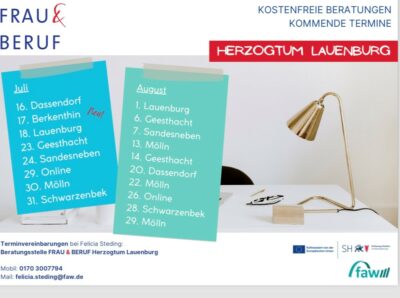 (pm) Nach einer kleinen Sommerpause startet die Beratungsstelle Frau & Beruf Herzogtum Lauenburg im Juli wieder mit vertraulichen, unabhängigen und kostenfreien Beratungsterminen: 16. Dassendorf / 17. Berkenthin / 18. Lauenburg / 23. Geesthacht / 24. Sandesneben / 29. Online / 30. Mölln / 31. Schwarzenbek. Eine individuelle Terminvereinbarung für Mölln oder für eine Onlineberatung ist ebenfalls möglich.
