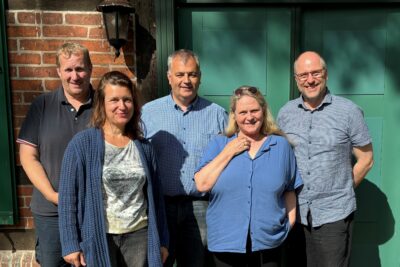 Gemeinsam für die Friedhöfe: Die Bürgermeister:innen Reiner Lübcke (Behlendorf), Doreen Keding (Walksfelde), Lars Wunsch (Nusse) und Frank Hase (Amtsdirektor Berkenthin, nicht im Bild) freuen sich gemeinsam mit Petra Müller-Koop (Friedhofsausschuss Kirchengemeinde Nusse-Behlendorf) und Pastor Tobias Pfeifer über die Einigung. (Foto: Frank Hase)