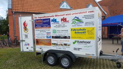 Stefan Krüger (kurz „Korl“ genannt) sowie den Kindern und Jugendlichen der Jugendfeuerwehr Bliestorf war die große Freude anzusehen. Zahlreiche Firmen konnten als Sponsoren zum Erwerb eines eigenen Anhängers und einer Hüpfburg gewonnen werden. Die Jugendfeuerwehr benötigte immer wieder fremde Fahrzeuge oder ähnliches für den Transport der eigenen Gerätschaften zu ihren Ausfahrten oder Wettkämpfen. So wurden Unterstützer für die Jugendfeuerwehr zur Beschaffung eines Anhängers gesucht und auch schnell gefunden. Die Firmen fanden diese Idee sehr gut und sagten schnell ihre Unterstützung zu. Durch die so tolle Unterstützung der Firmen konnte auch der 2. Wunsch der Jugendfeuerwehr erfüllt werden, es wurde gleichzeitig eine riesen Hüpfburg besorgt. Diese hat eine Größe von 12 x 6 x 4,5 m, ist mit einer Rutsche ausgestattet und kann sogar an einen Pool angeschlossen werden.