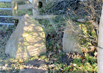 Meine Tochter und ich machten uns gleich auf die Suche. Das Betreten der Felder ist verboten, aber in einem Knick am Feldrand entdeckten wir zwei große Steine, die tief in der Erde steckten und kaum noch als Durchgang zu erkennen waren. Einen weiteren Steindurchgang haben wir an der Steinau in Mannhagen gefunden. Hier wurde ein Knick gerodet, aber die Findlinge, die den Durchgang markierten, blieben stehen.