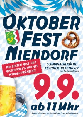 Am kommenden Sonntag ist es wieder soweit! O`zapft is! Ab 11.00 Uhr richtet die Freiwillige Feuerwehr Niendorf das diesjährige Oktoberfest aus. Neben Oktoberfestbier gibt es natürlich auch Weißwurst, Leberkäse, Bratkartoffeln, Sauerkraut, Braten und viele andere Leckereien. Die „Niendorfer Damen“ bieten außerdem Kaffee und Kuchen an. Wie immer werden die besten Wiesen-Outfits prämiert. Außerdem gibt es dieses Jahr eine Tombola.